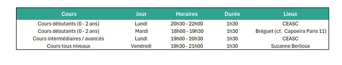 Extrêmement bien situé dans le centre de Paris, les salles sont spacieuses et lumineuses, idéales pour la pratique de la capoeira. Les cours reprendront à partir du lundi 8 septembre 2025.